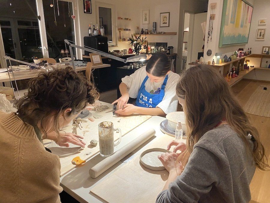Our courses consist of two evening appointments where you come to the pottery by yourself or with up to three friends (or family members, or colleagues). On the first evening we will make pottery together. We ask you for your own ideas or discuss with you what you might want to tackle and we explain the various techniques to you. You do not need any previous knowledge, but if one or the other has already experienced pottery, we are happy to cater for their level of expertise.